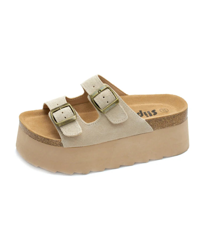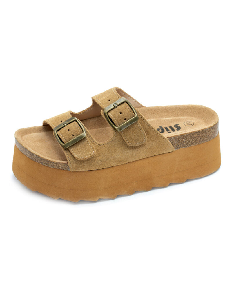 כפכפי פלטפורמה עם שתי רצועות עור זמש, אבזמים מתכווננים ורפידה מרופדת. סוליה גבוהה בשילוב שעם לנוחות ויציבות לאורך כל היום
